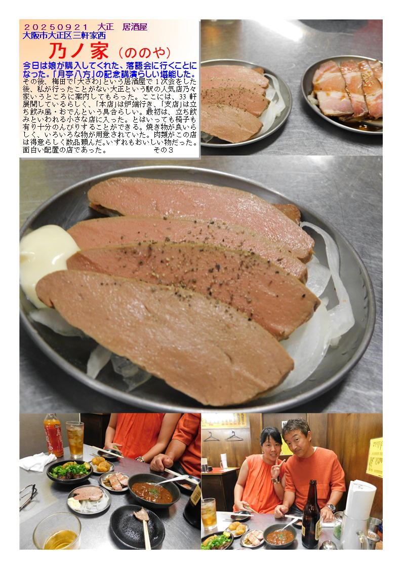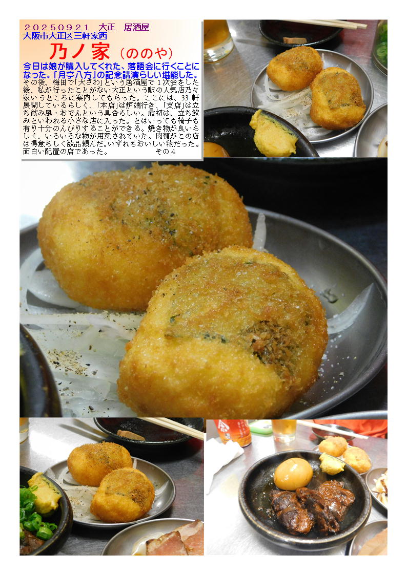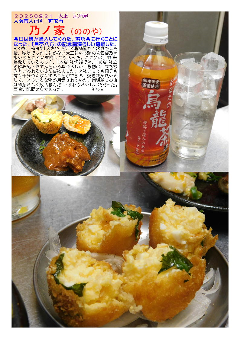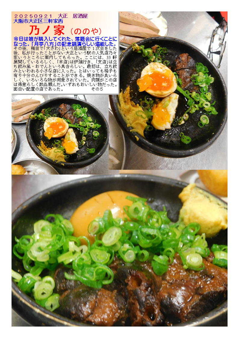 今日は娘が購入してくれた、落語会に行くことになった。「月亭八方」の記念講演らしい堪能した。その後、梅田で「大ざわ」という居酒屋で1次会をした後、私が行ったことがない大正という駅の人気店乃々家いうところに案内してもらった。ここには、33軒展開しているらしく、「本店」は炉端行き、「支店」は立ち飲み風・おでんという具合らしい。最初は、立ち飲みといわれる小さな店に入った。とはいっても椅子も有り十分のんびりすることができる。焼き物が良いらしく、いろいろな物が用意されていた。肉類がこの店は得意らしく数品頼んだ。いずれもおいしい物だった。面白い配置の店であった。