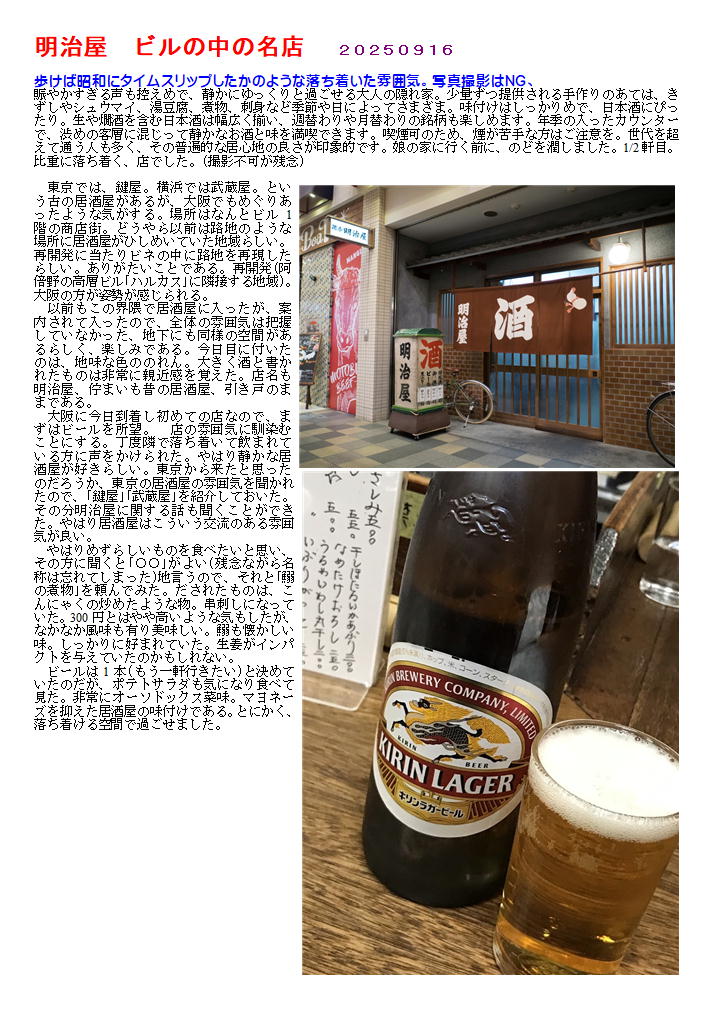 大阪に今日到着し初めての店なので、まずはビールを所望。 店の雰囲気に馴染むことにする。丁度隣で落ち着いて飲まれている方に声をかけられた。やはり静かな居酒屋が好きらしい。東京から来たと思ったのだろうか、東京の居酒屋の雰囲気を聞かれたので、「鍵屋」「武蔵屋」を紹介しておいた。その分明治屋に関する話も聞くことができた。やはり居酒屋はこういう交流のある雰囲気が良い。