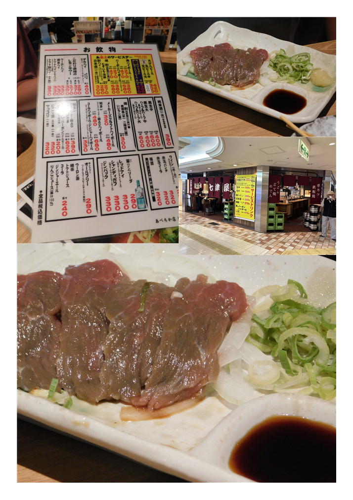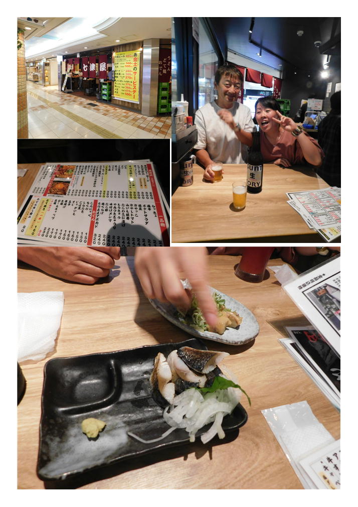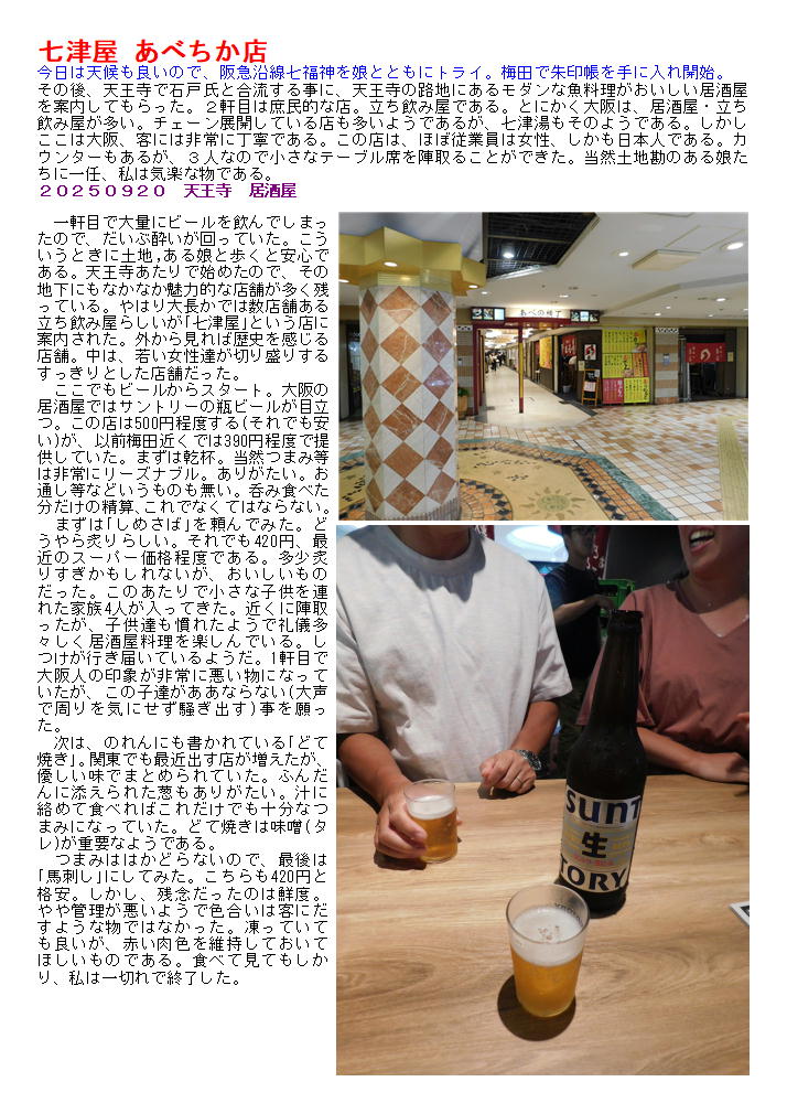 その後、天王寺で石戸氏と合流する事に、天王寺の路地にあるモダンな魚料理がおいしい居酒屋を案内してもらった。2軒目は庶民的な店。立ち飲み屋である。とにかく大阪は、居酒屋・立ち飲み屋が多い。チェーン展開している店も多いようであるが、七津湯もそのようである。しかしここは大阪、客には非常に丁寧である。この店は、ほぼ従業員は女性、しかも日本人である。カウンターもあるが、3人なので小さなテーブル席を陣取ることができた。当然土地勘のある娘たちに一任、私は気楽な物である。