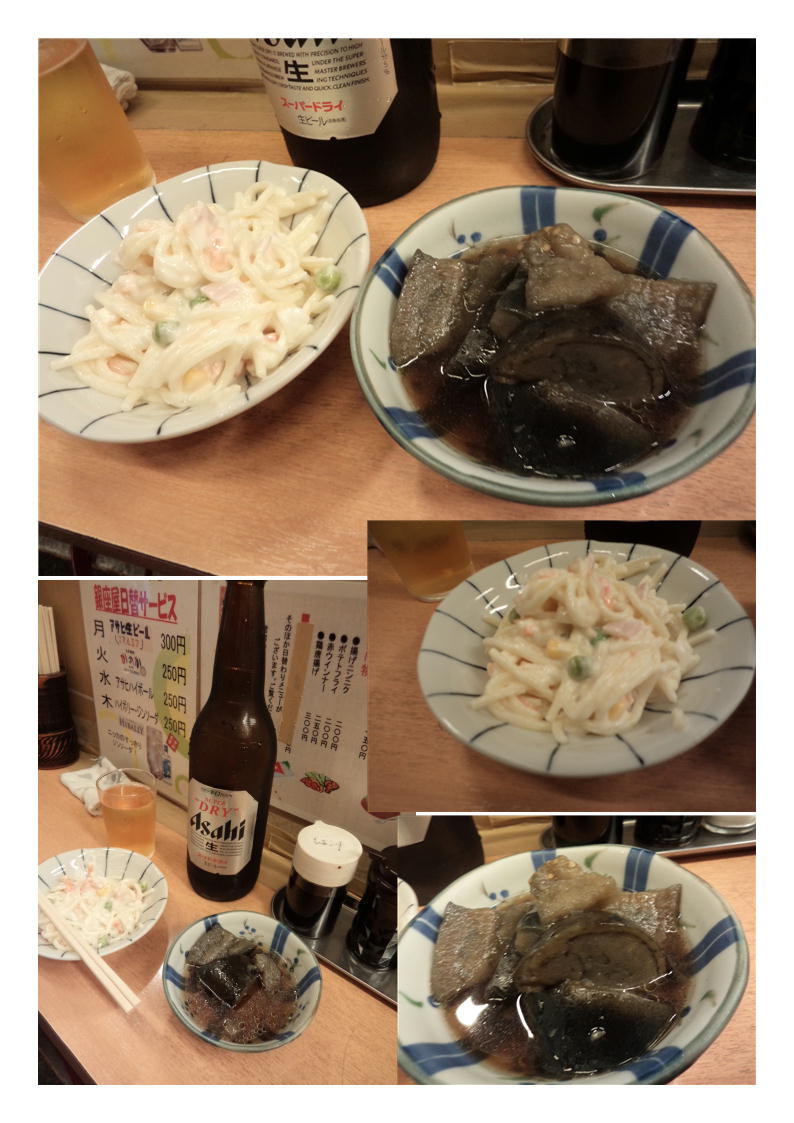まずは、ビール。ここのビールは、則にいう「おきづけ」。優しい温度に管理されている。つまみは、まず①マカロニサラダ②茄の煮浸しにしてみた。いずれも、200円以下の価格、安心して飲めそうである。飲み物の日替わりサービスなどもあるようである。ここはさくっと飲んで次にいくことにした。