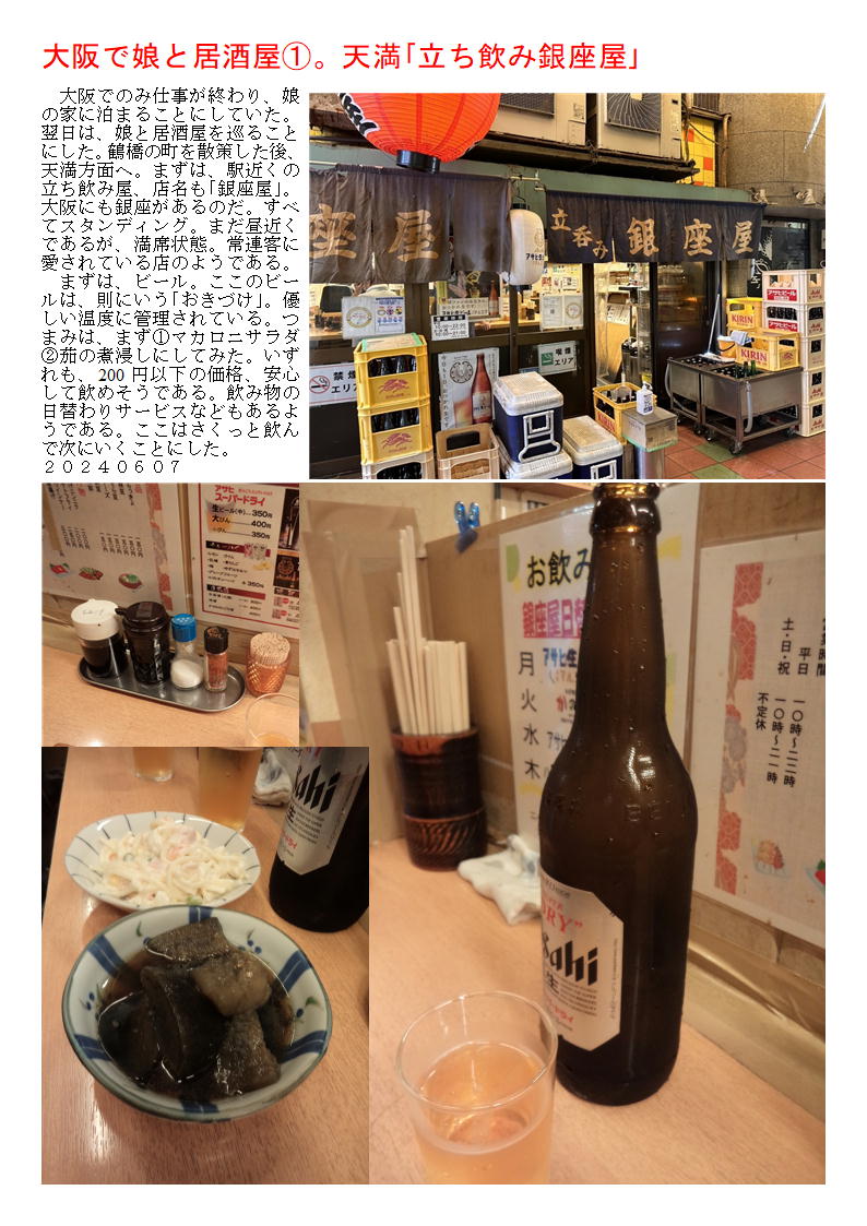 大阪でのみ仕事が終わり、娘の家に泊まることにしていた。翌日は、娘と居酒屋を巡ることにした。鶴橋の町を散策した後、天満方面へ。まずは、駅近くの立ち飲み屋、店名も「銀座屋」。大阪にも銀座があるのだ。すべてスタンディング。まだ昼近くであるが、満席状態。常連客に愛されている店のようである。