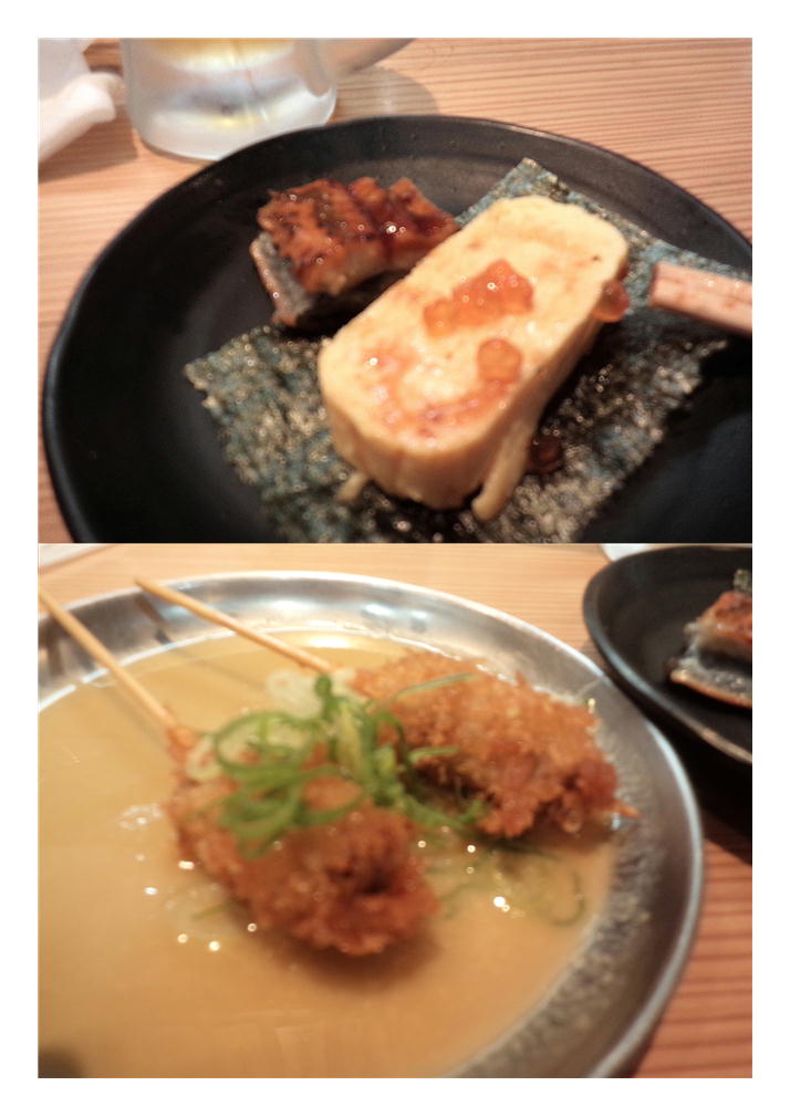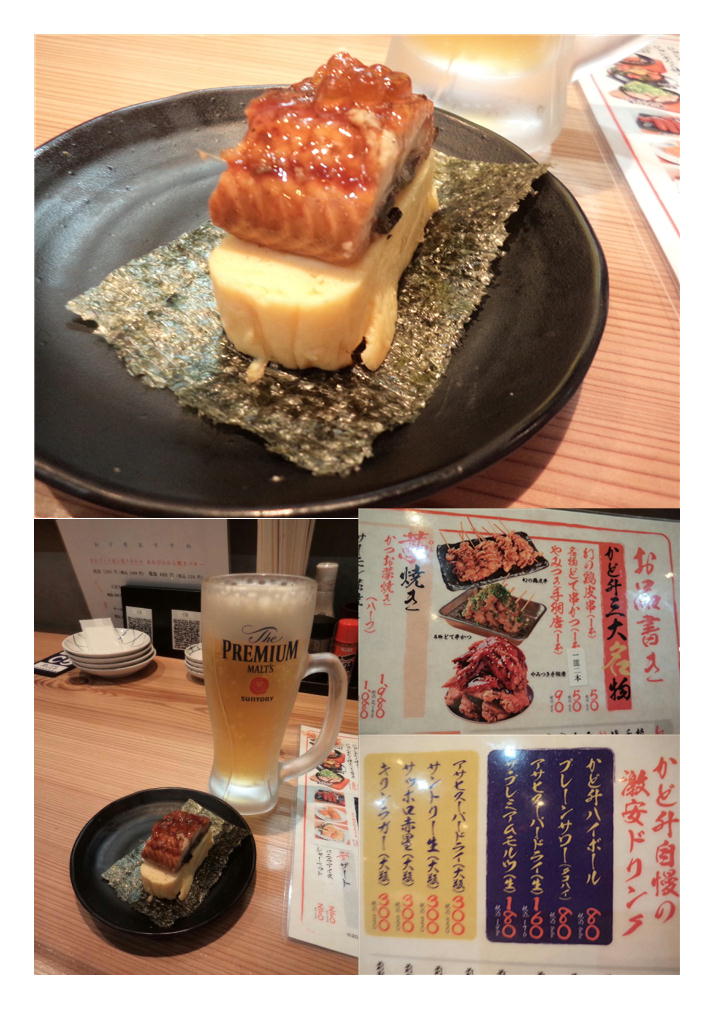 カウンターに案内され、落ち着く。この雰囲気で注文はスマホから、やはり最近はスマホがなければ酒場でも自由にならないらしい。当然、160円のビール(アサヒスーパードライ)を頂く。飲み物が安いのは魅力である。すると鰻がのっ玉子(お通し)がだされた。高いかなと思えば、350円。我慢できる範囲である。