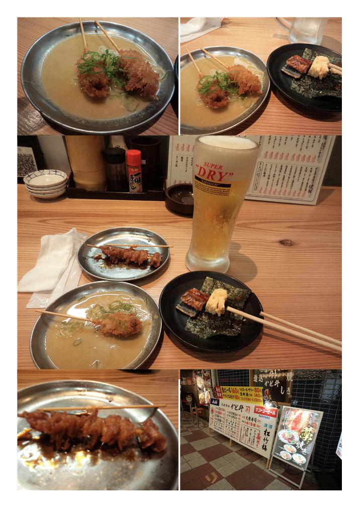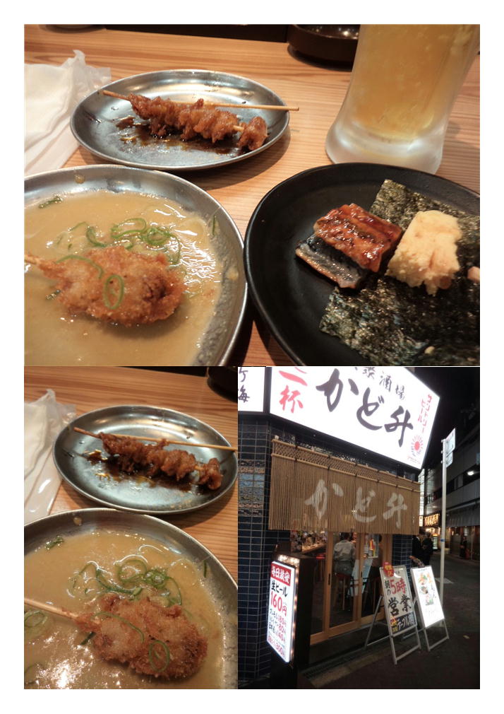 なかなかおいしいもの、大切に頂く。まさか鰻のお通しがだされるとは思わなかった。注文は最小限にするつもりだったので、①土手串カツ(50円×2)②幻の鶏皮串(50円×2)。50円まつまみなどこの界隈でなければあり得ないもの。「かど升三大名物」から選択してみた。いずれもビールの相性は抜群、2杯目は「プレミアムモルツ180円」とランクを上げてみた。