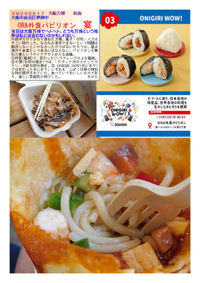 ①杵家(饂飩)で、変わった(?_?)クレープのよな饂飩。②千房(お好み焼きョでは、大阪お好み焼き・スティク状のスナツクウドン。③ONIGIRI NOW(おにぎり)では変わったおにぎり。いずれも゛んぱく仕様の特別な物が提供されていた。食べていておいしいものであり、楽しい雰囲気の物でした。