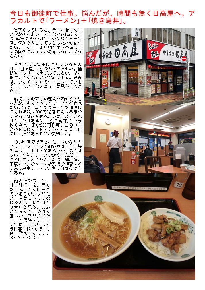 私の情報は、facebook twitter. を確認ください。「中華街を大切にする人」「ご利用する人」にはご協力をします。 中華街で知りたいこと、紹介してほしいこと等あれば ご連絡ください。sosamu@ya2.so-net.ne.jp 中華街を好きになってくれる人が増えることを願っています。 中華街は、中華街の魅力を、最近の中華街は中年おじさんの散策part2-ご覧ください。 私のもう一つの趣味、山登り(過去の記録をまとめています)。山好きおじさんの部屋 もご覧ください。 今日も御徒町で仕事。悩んだが、時間も無く日高屋へ。アラカルトで「ラーメン」+「焼き鳥丼」。