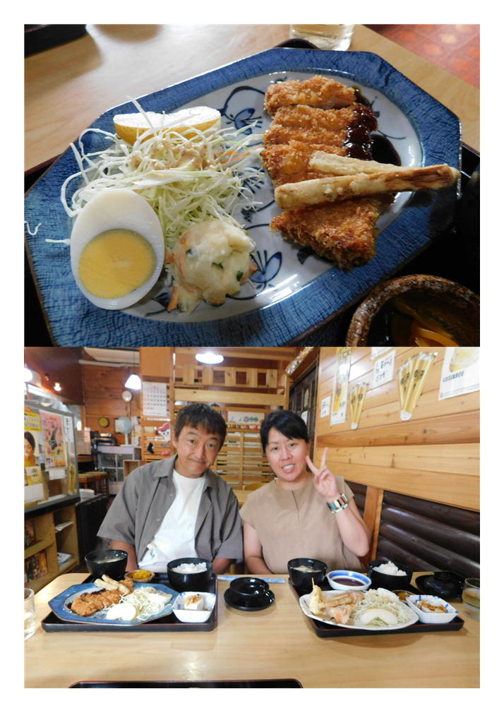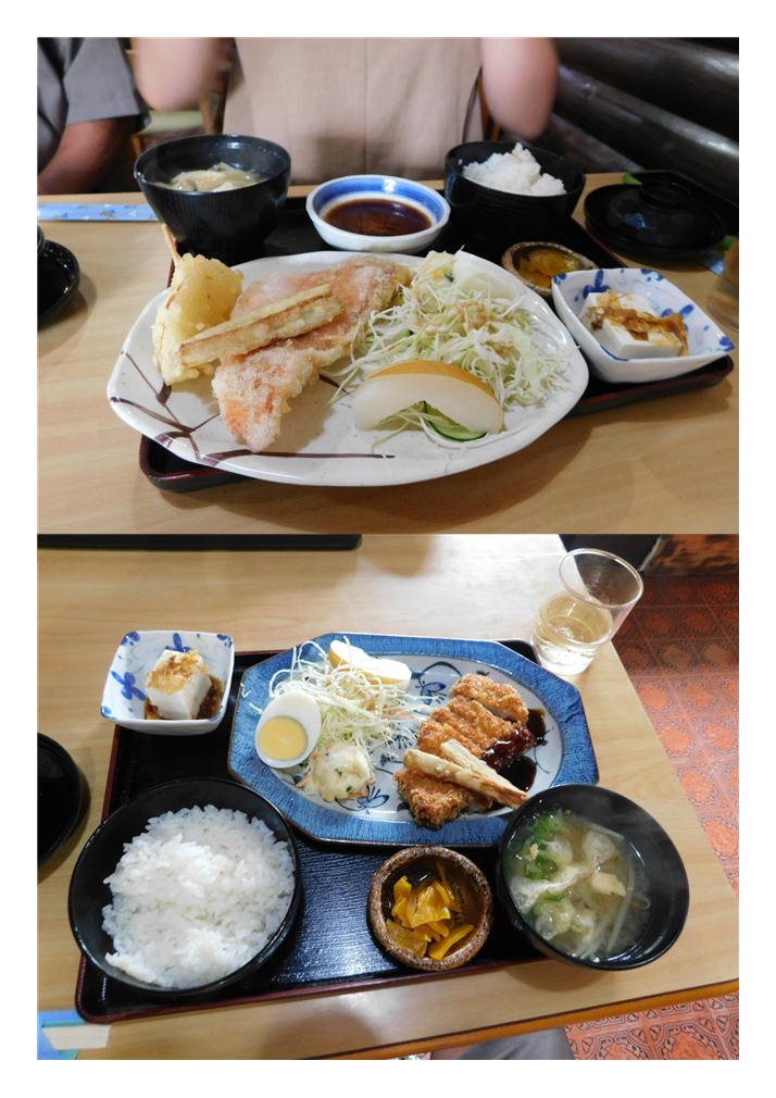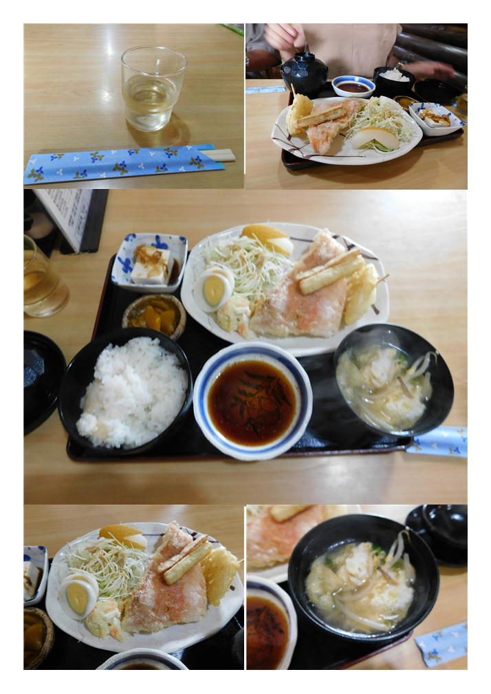 娘の頼んだ定食は、正式には「魚唐揚げ定食」。どんな物が提供されるか興味があったが、魚3種の盛り合わせになっていた。聞けば、「赤魚・キス・鰺」しなっていた。やはり、海が近いというのはさすが、唐揚げというよりは天麩羅のような物だった。海鮮を食べたかった娘は上機嫌。あたりだったようである。当然つきあわせは、とんかつとほぼ同じ。ごぼう天も添えられていた。