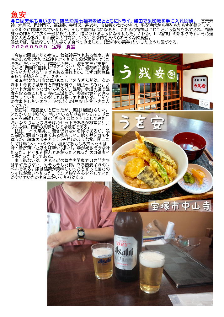 私は、「木の葉丼」。聞き慣れない名称であるが、娘に聞けば関西では良くある物らしい。他人丼とは多少違うが、蒲鉾の玉子とじ(玉子丼)のような物、関西にしては珍しい、つゆだく。加えておもしろ買ったのは、味・当然薄いと思えば辛い(濃い)。喉が渇きそうな味だった。ビールを頼んで良かったと思ったのは娘もいつ署だったようである。
