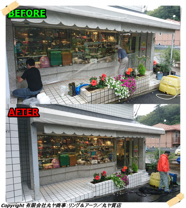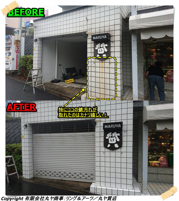 画像だと一枚一枚の違いが伝わりにくいのがとても残念なのですが、それでも花壇の下のタイルとか、電動シャッター脇の丸ヤの看板のしたの錆汚れが完全にとれているだけでも、その洗浄能力の凄さが充分に伝わるかと思います。