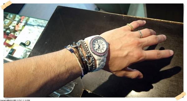 ミサンガに革、シルバーのブレスレット、セラミックの時計、はたまたイエローゴールド指輪もあればホワイトゴールドの指輪まで、同じ素材が二つとして無いカオスな組み合わせですが、これはこれで気にいっておりますっ♪