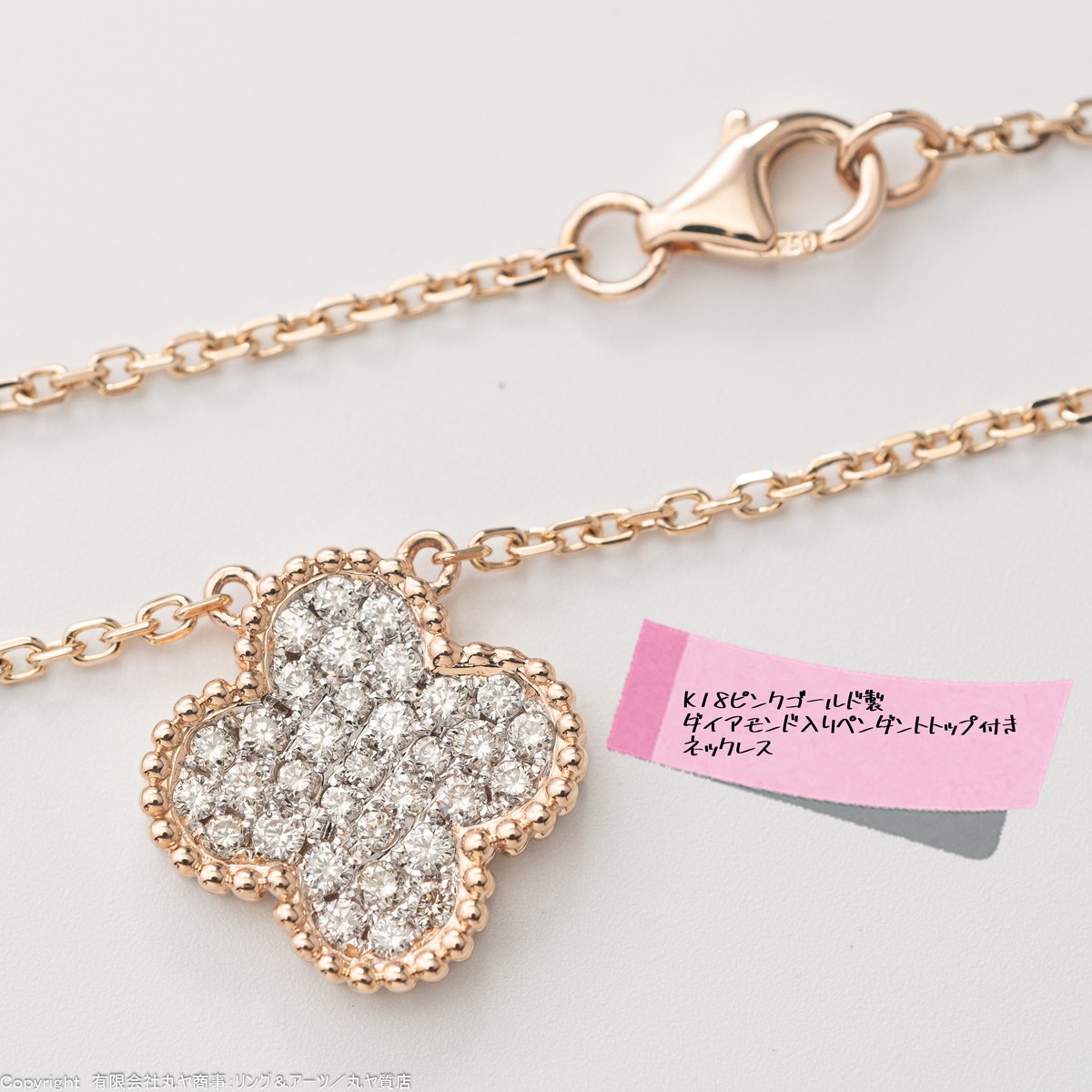 K18ピンクゴールド枠ダイアモンド入りフラワーモチーフペンダントトップ付きネックレス K18ピンクゴールド枠ダイアモンド入りフラワーモチーフペンダントトップ付きネックレス/Necklace with flower motif pendant Products using 18k pin ◆管理番号:45848◆K18ピンクゴールド枠ダイアモンド入りペンダントトップ付きネックレス◆素材:K18(=750/1000PG=18金)◆ダイアモンド石目(宝石の質量):0.55ct(カラット)◆サイズ(実測値)・ペンダントトップ:横幅14.9mm×縦15.0mm×厚み2.7mm・チェーン:42cm◆参考定価:20~35万円程度※定価=一般的な宝石店における販売価格当方取扱ジュエリーは一般的な宝石店の1/3~1/5の価格で販売させて頂いている為、当店販売価格を3~5倍して頂くと一般的な宝石店の販売価格が算出できます。※当店が一般的な宝石店の1/3~1/5の価格で販売出来る理由→その価格で"売らざるを得ないから"です。当方の勤めている質屋兼リサイクルショップ(以下、当店)では販売と同時にお買取りもさせて頂いております。当店におけるお買取り価格は、言い換えれば当店の原価です。つまりは、当店が販売させて頂いたジュエリーを、同じく当店でご売却されると、そのお客様は、当店でご購入頂いた商品の原価、及び利益額や率を知る事が出来てしまいます。その為、販売時に一般的な宝石店さんのような高いお値段で販売してしまうと、販売価格と買取価格の価格差が大きくなり、その結果として、買取の安い店、もしくは儲け過ぎな店という悪い印象をお客様に与えてしまう恐れがあります。しかし、当店では、お客様に販売価格の安い店、もしくはお買取り価格の高い店と認知してもらいたい為、販売価格を業者間における卸価格に準拠して算出する事で、お安く"売らざるを得ない"のです。◆付属品:無し◆コンディション:SA◆補足情報1:ノンブランドジュエリーです。新品仕上げ済みの商品の為=SAランクと評価させて頂きました。※新品仕上げとは?: 新品仕上げとは、研磨や洗浄等して汚れや傷を修復し、使用感のある貴金属製品を新品同様の状態に戻す作業です。 ◆補足情報2:正規品の証明となる鮮明な画像の掲載⇒品位刻印の画像を添付しました。◆補足情報3:具体的な入手ルート⇒提携質屋兼リサイクルショップより商品を提供して頂いている為、質屋鑑定済みの商品となります。#K18 #18金 #750 #750PG #750/1000 #ゴールド #Gold #ネックレス #necklace #ダイヤモンド #ダイアモンド #ダイヤ #ダイア #DIAM via 【有限会社丸ヤ商事:丸ヤ質店/リング&アーツ】オフィシャルサイト Your own website, Ameba Ownd