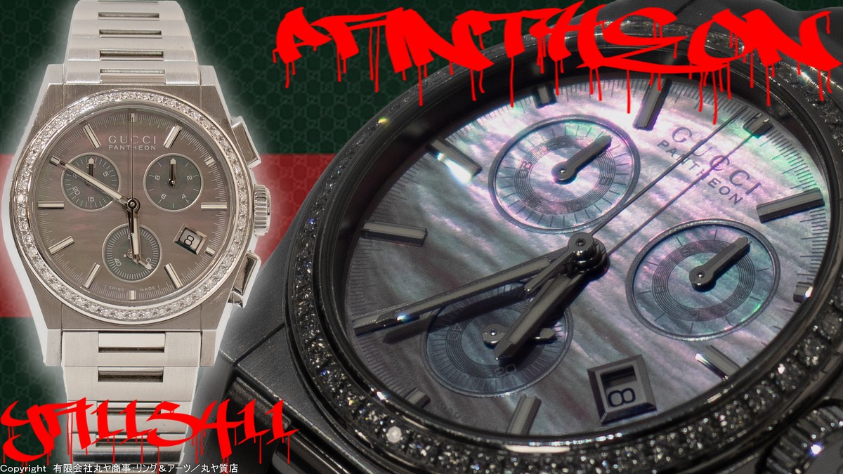 グッチ:パンテオンクロノグラフベゼルダイヤ黒シェル文字盤QZユニセックス腕時計/Ref.YA115411型(115.4)/GUCCI/PANTHEONCHRONOGRAPH | 【有限会社丸ヤ商事:丸ヤ港南台店オフィシャルウェブショップ