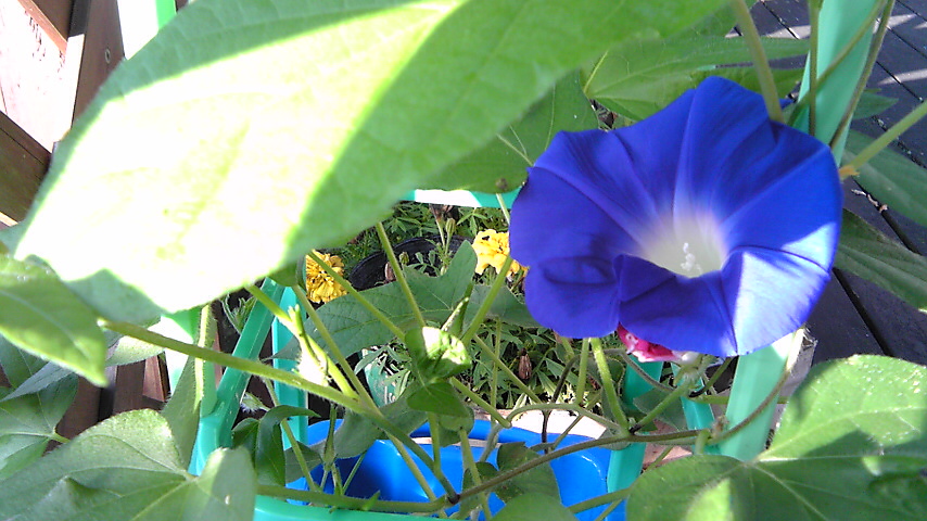 息子が夏休み中,小学校から持ち帰っている我が家のアサガオ。毎日,新しい顔を見せ,元気をくれる。今朝は青いのが咲いていました。