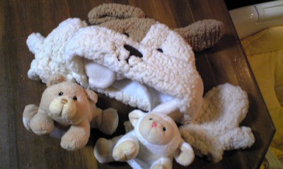 かわいいギフトアメリカから次男の誕生にとってもかわいいギフトが届きました。いつもそうなんですが、まずはお兄ちゃんが試着します。今日からまた主人がいないのですが、明日は出勤、そしてあさっては地区の美化運動だそうで、子供二人連れてどうやって参加しようかと。でも、明日から雨だそうですね。