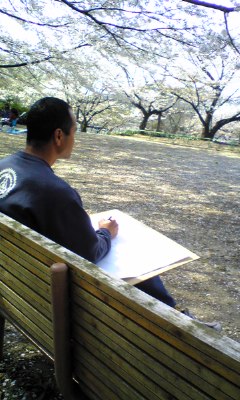 パターゴルフ&絵ただのお花見ではありません。トーナメント方式のパターゴルフ大会と全員が桜の絵を描き、品評会があります。そして、入賞者には賞金が!参加者を喜ばせるエンターテインメント、大変勉強になりました。写真は絵を描く夫。