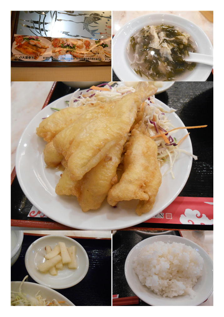 定食の品数は、定番。ご飯・スープに香の物、メイン・デザートがつくタイプ。私はこれをランチフルセットと言っている。キスは5尾ほど揚げられた物が出された。優しく醤油がかけられているが、これがニンニク醤油なのかもしれない。食べて見れば、あっさりしたフリッター状の揚げ物に味が醤油がマッチ。蒜も利いている。