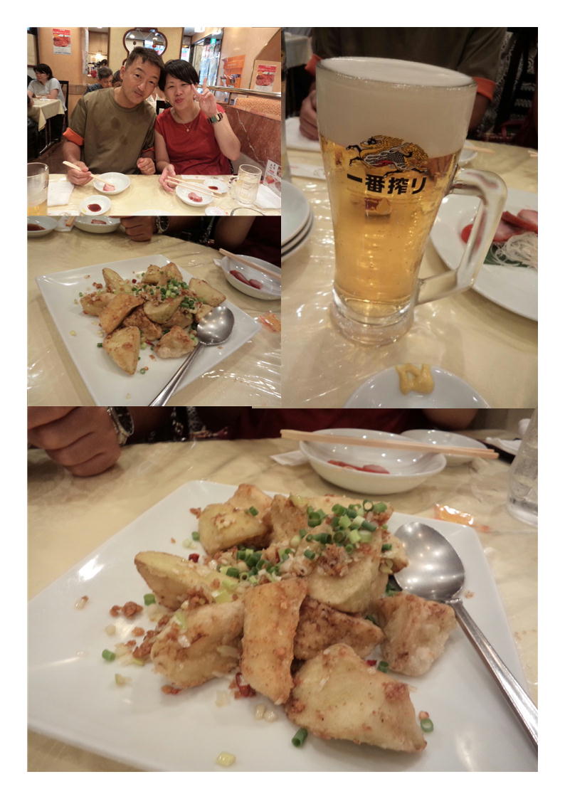 今日は十分お酒が飲める3人。外は30度を超えている。ビールが美味しい。ジョッキも冷えていて準備は万全の物である。注文としては、①ブダイ揚げ物甘酢和え(魚の姿揚げ甘酢ソース掛け)②ヤリイカの塩胡椒揚げを頼んでみた。連れの者の希望で、数店舗体験したいというので、あまり多くを一カ所で食べる訳にはいかない。