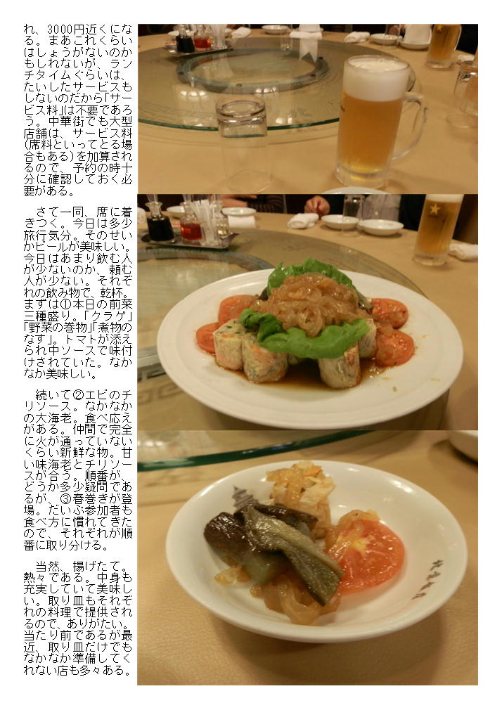 さて一同、席に着きつく。今日は多少旅行気分。そのせいかビールが美味しい。今日はあまり飲む人が少ないのか、頼む人が少ない。それぞれの飲み物で、乾杯。まずは①本日の前菜三種盛り。「クラゲ」「野菜の巻物」「煮物のなす」。トマトが添えられ中ソースで味付けされていた。なかなか美味しい。