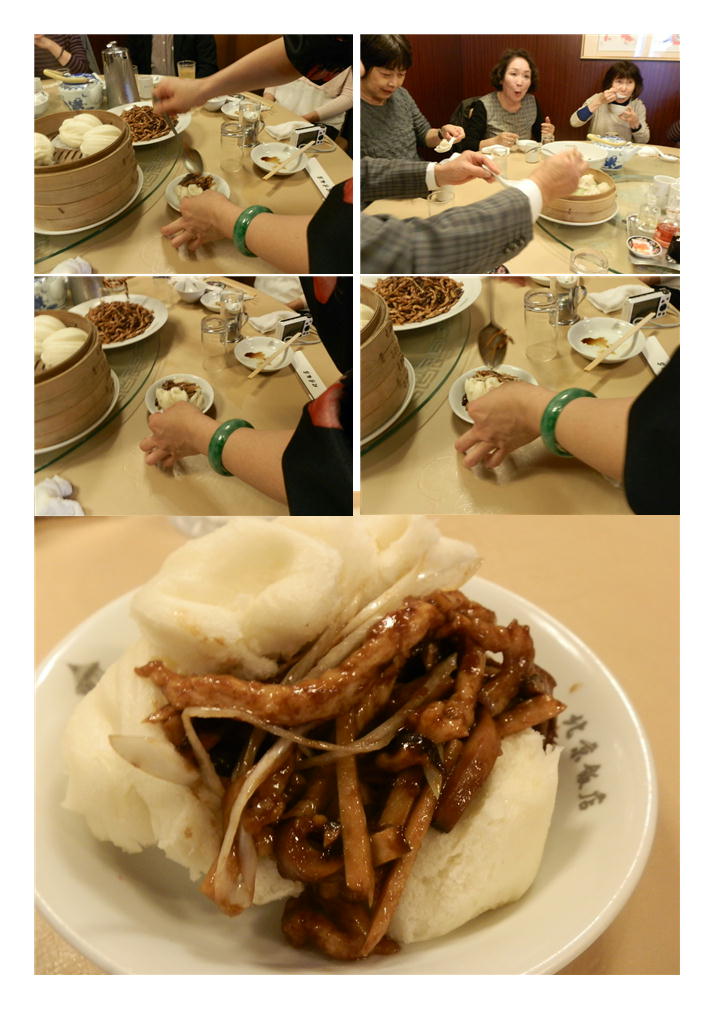 最後は、⑦豚肉の甘味噌炒め。さすが点心コース。蒸しパンに破産で食べる方式である。こちらも私の物で、食べ方の見本を示してもらう。なかなか饅頭の中に収まらない方もいたが、それも一興。楽しみ・思い出の一つとなったと思う。こってりとした味付けは、なかなか濃厚。