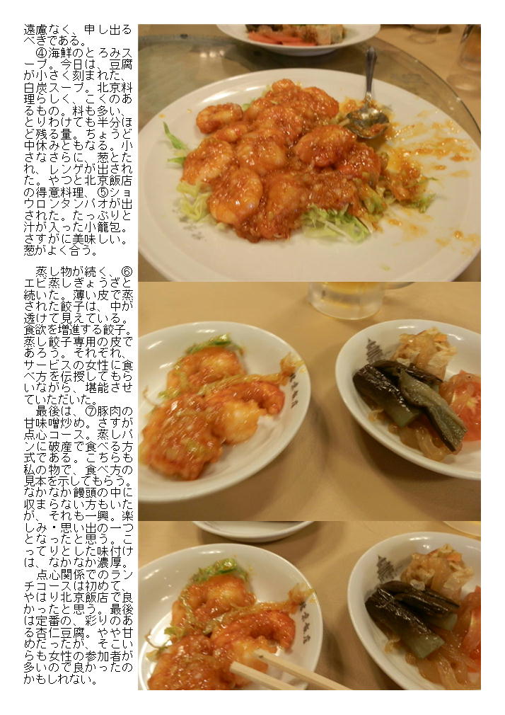 点心関係でのランチコースは初めて、やはり北京飯店で良かったと思う。最後は定番の、彩りのある杏仁豆腐。やや甘めだったが、そこいらも女性の参加者が多いので良かったのかもしれない。