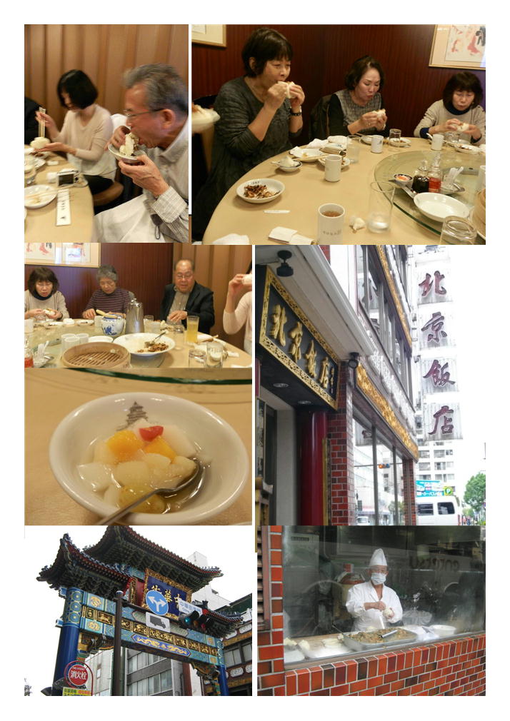 山下公園を垣間見た後、グランドホテルを案内し、もう一つの横浜(歴史的建造物)をみていただきました。時間がなく、マリンタワーからの眺望はあきらめましたが、13時少し前、普段は入らない、東門殻の中華街に入りました。今日の目的の料理(これから6回、様々な料理をテーマして運営)は北京料理、門近くの北京飯店へ向かいます。