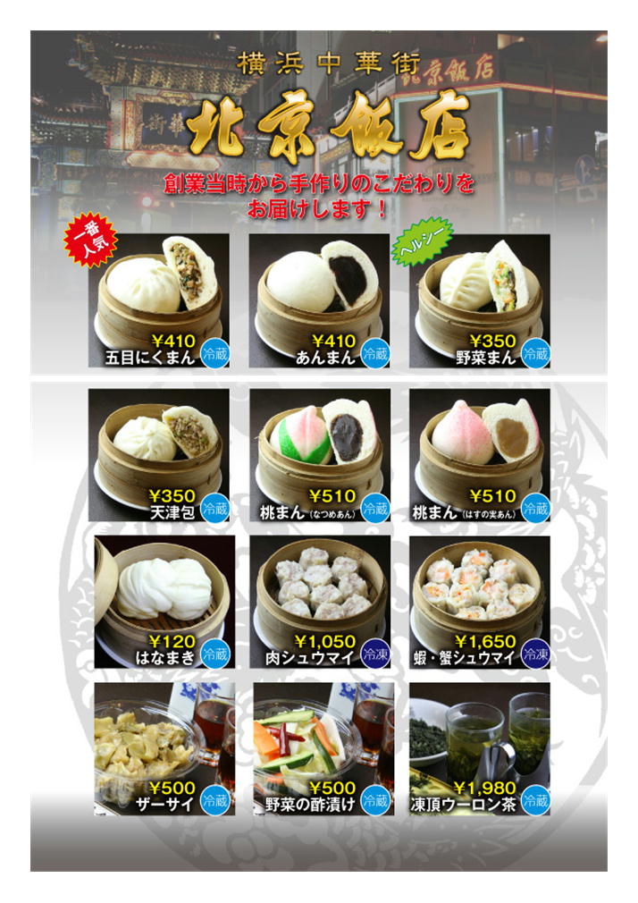 北京ダックを日本に紹介したとも伝えられる北京飯店、朝陽(東)門に隣接する角地で中華街に客を迎えてくれている。なんと言っても点心の充実。通りに面するショーウィンドウでは、職人が美味しそうな饅頭・小籠包を作っている。