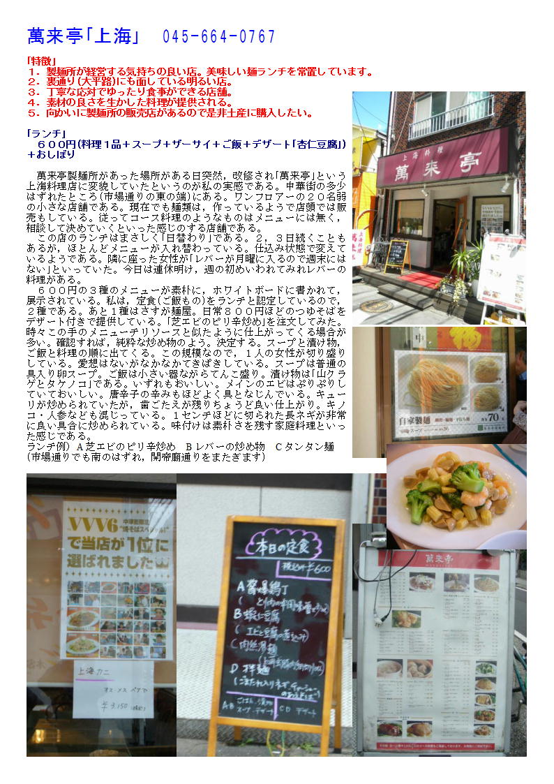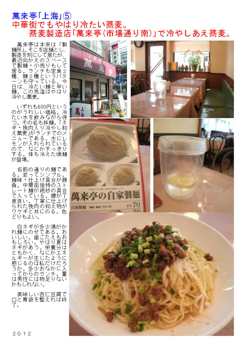 前回と似たようなメニューが出されていた。今回は奥さんも同行。拌麺(豚ひき肉入り葱冷やし和え蕎麦)。残暑も終盤。何か食べたくなった。店も模索したが、今回は奥さん好みの店が良い。お洒落で、薄味仕上げとなれば、やはり上海料理「萬来亭」に落ち着くことになった。