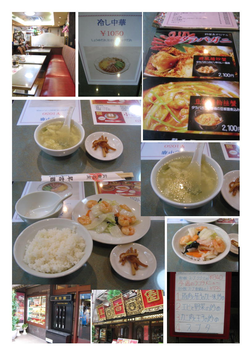 その中から、炒素什景(五目季節野菜炒め)を頼んで見る。まずは、御飯・スープ・香の物が出される。今日は「玉子スープ」「中国高菜と枝豆の炒め物」。なかなかおいしい。高菜の和え物は多少ごま油、ピリ辛味。これだけでも御飯が進む。