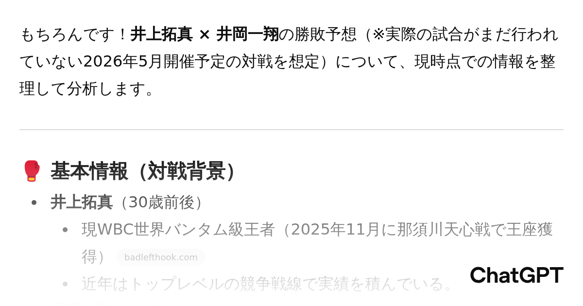 また、5月での対戦が予定されている中谷潤人(M・T)や、フェザー級のラファエル・エスピノサ(メキシコ)が、将来的に井上の前に立ちはだかる可能性があると見込むも、現時点では「明確なライバル不在」と主張する。