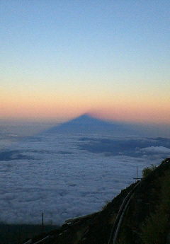 富士登山3八合目で休憩をとりました。山小屋を予約して行かなかったのですが、八合目にある4つの山小屋の最後にある所になんとか泊まることができました。ちょうど日も落ちてナイスタイミング★山小屋はぎゅうぎゅう詰めの雑魚寝状態でした。影富士 富士山の後ろからの夕日が富士山の影をすそ野に作っていました!