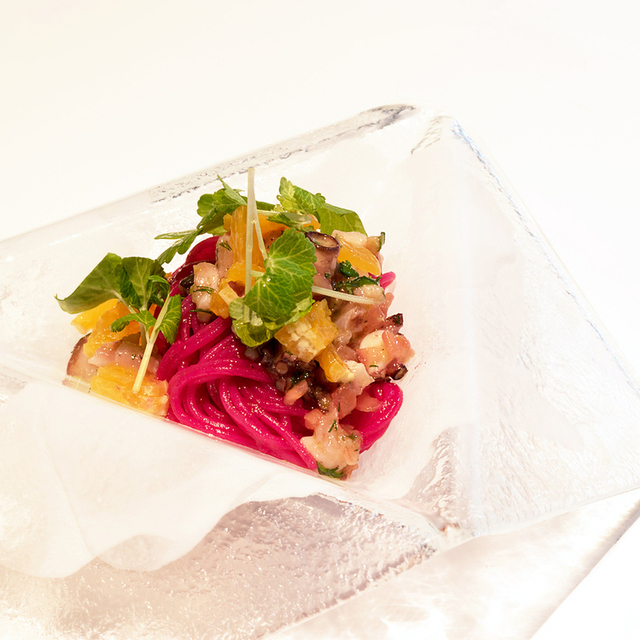 🔼前菜盛り合わせ=ごぼうの温かいスープ、ゴボウの香りがスゴイ。 生ハム、桜エビのフリッタータ。