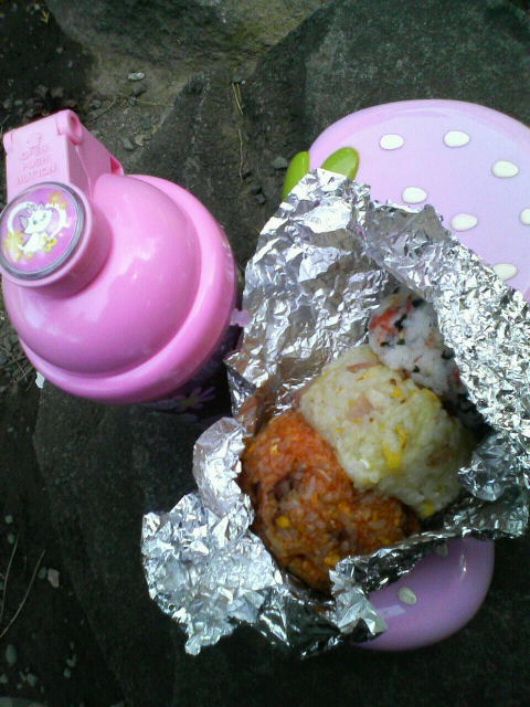 お弁当箱の中身をみなさんにお見せしたいのは山々なんですが…。衝撃的映像になってしまいますので、三色おむすびだけお楽しみください(^_^)v