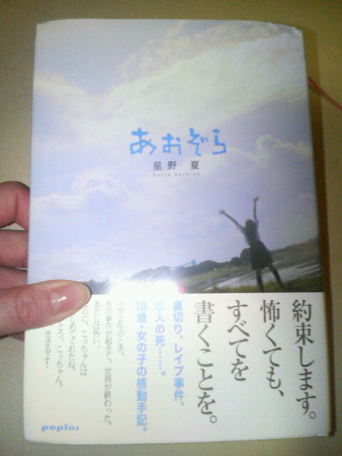 話はかわりますが今日は目がはれてるんです…。なぜかというと、昨日この“あおぞら”という本を読んで、これでもかというくらい涙をながしました(;_;)一気に読んで一気に1リットルくらいの涙を流しました…。(笑)この本は18歳の女の子の感動手記なんですけど!この女の子は私には想像できないくらい、いろいろな苦しいことや悲しいこと経験しています!でも今はその経験のなかで大切なものをたくさんみつけて、強く生きて素敵な人生を送っているんです…。