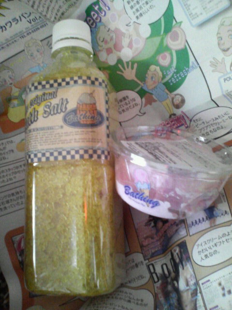 ゲルマニュウム、にがり、バスソルト、日本酒…。ナドナドです!今日はバスイングっというお店で買ったバスソルトとボディソープです☆ここのお店、本当に可愛いんですよぉ~!いろんな色や香りがあって、気分は上がりまくりですq(^-^q)アイスクリームみたいなんですぅ↑↑↑O(≧▽≦)Oよかったらチェックしてみてくださぁ~いッ(^_^)vハッピーなバスタイムになりますよッ☆☆