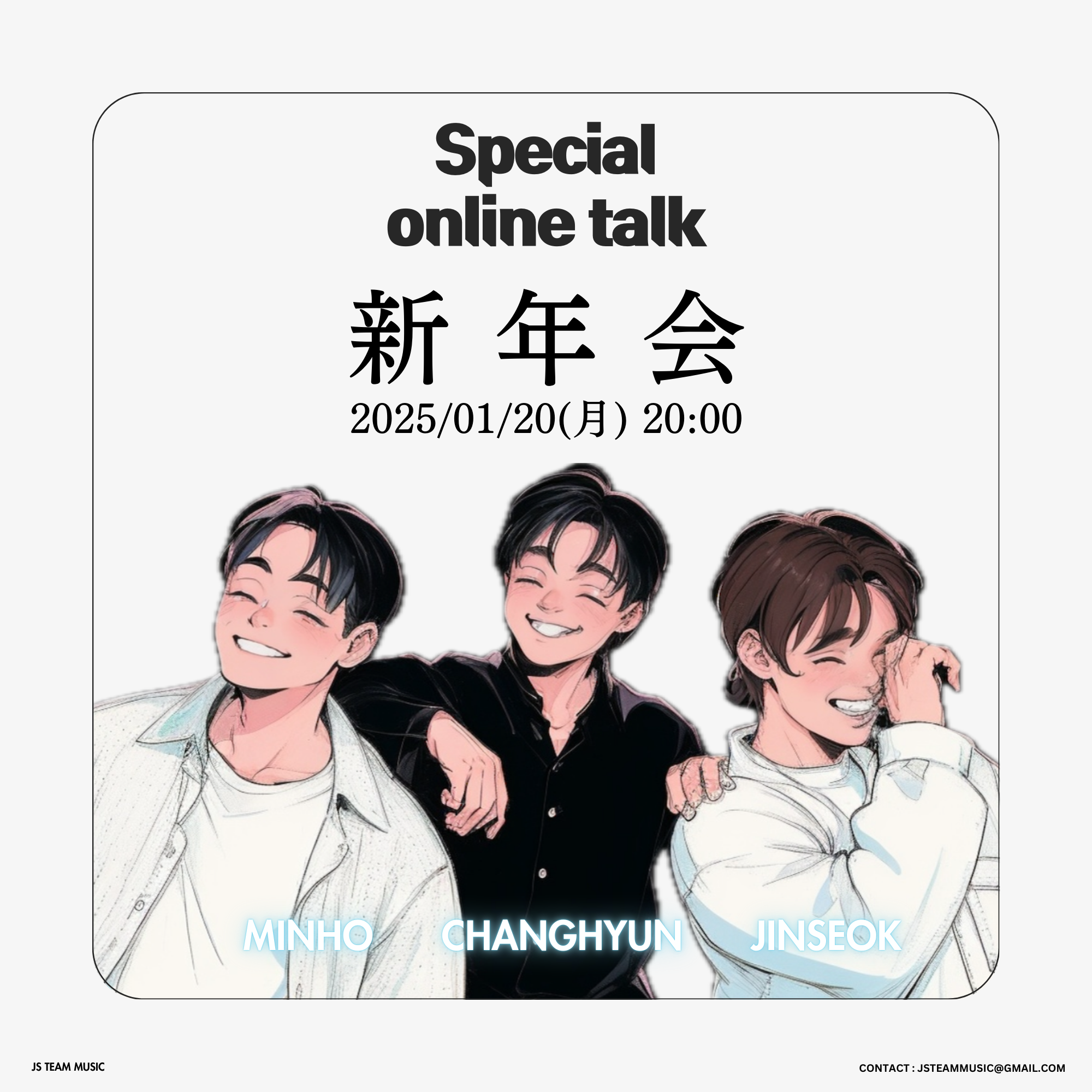 https://jsteammusic.themedia.jp/posts/56099203/ CHANGHYUN・MINHO・JINSEOK】2025.01.20(MON) SPECIAL ONLINE TALK SHOW ”新年会" | JS TEAM MUSIC