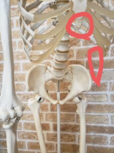 マッサージを前屈みでするので胸とお腹の境がつまります。そして左に傾く癖があるので赤丸の脇腹がつまります。