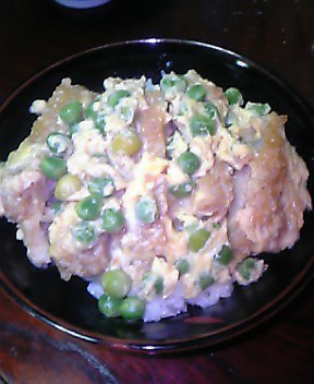 昨日剥きまくったえんどう豆をカツ丼の卵とじに入れて♪