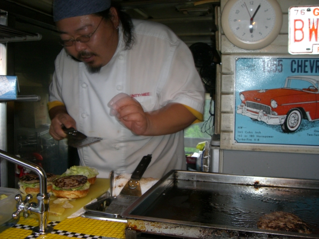 5分ほどで出来上がりアルミホイルに巻かれたバーガーを車で食す♪