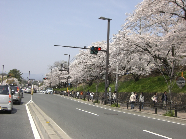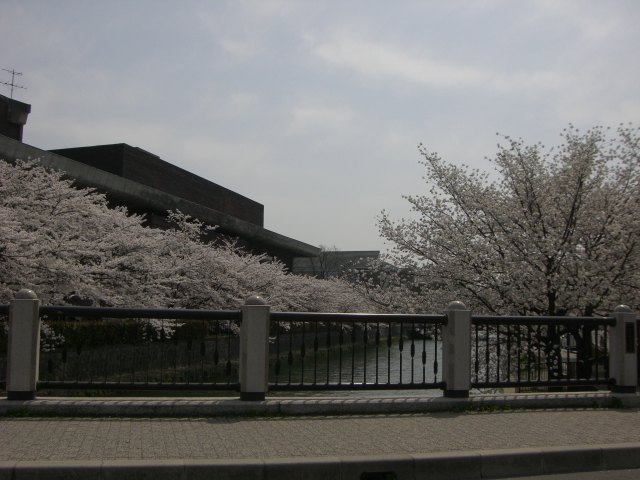 京都会館の裏は疎水を挟んで両側に満開の桜(写真右)