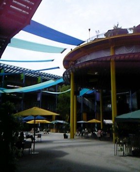中庭は屋外ステージと巨大TV