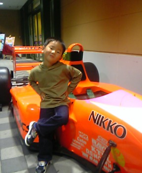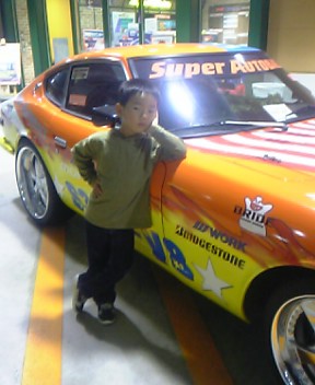 レーシングカーの前でポーズを取ってご機嫌♪