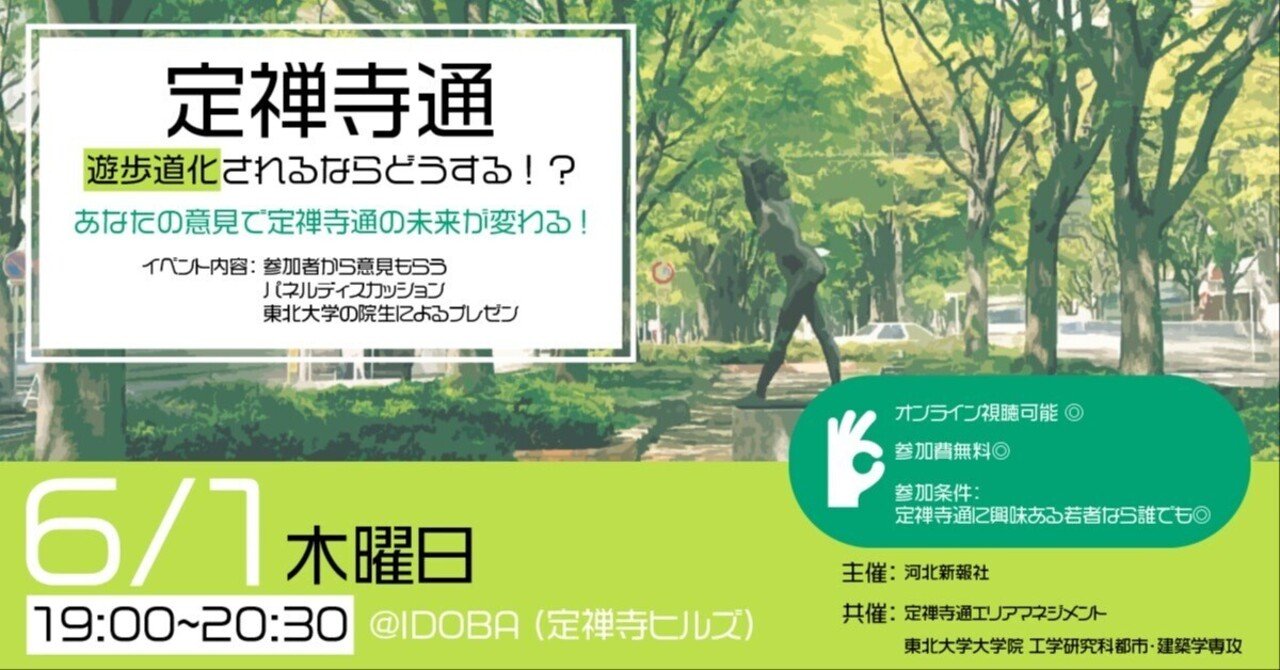 【未来のまちづくり】定禅寺通が遊歩道化されるならどうする!?■開催日時:2023/6/1(木) 19:00〜20:30(18:30受付開始) ■場所:IDOBA 定禅寺ヒルズ 5階forms.gle