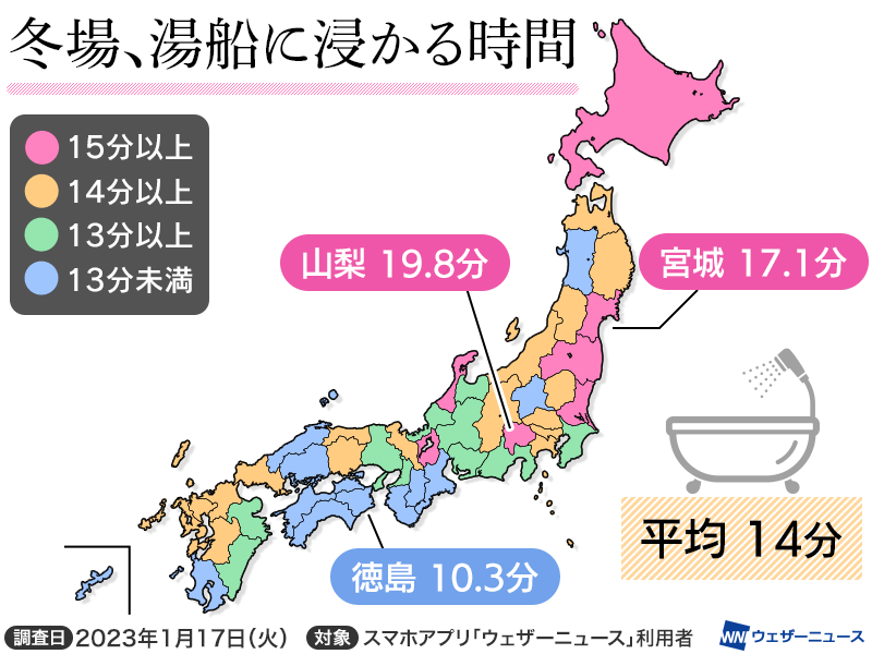 冬場、お風呂につかる時間は平均14分 西日本ほど短い傾向2月6日はお風呂の日。冬のお風呂についてウェザーニュースのアプリユーザーに調査したところ、湯船につかる時間は全国平均で14分。北〜東日本ほど長く、西日本ほど短い結果となり、南北差がみられました。weathernews.jp