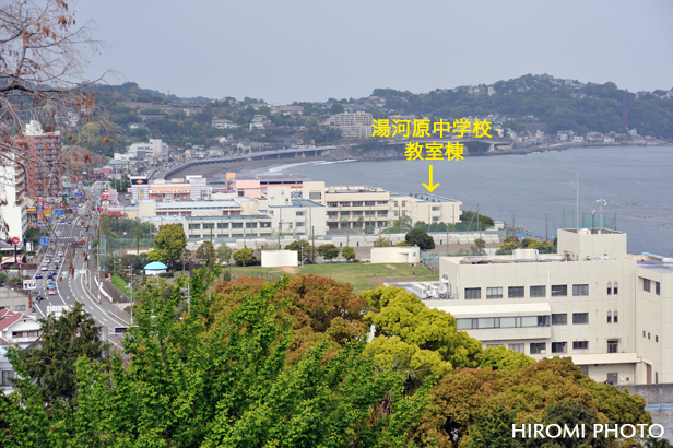 写真は、現在県から借りて利用している、湯河原中学校の校舎と、その周辺の様子です。海際の埋め立て地に建つ、築30年以上の旧湯河原高校を、湯河原中学校として借用しています。(平成21年~現在)
