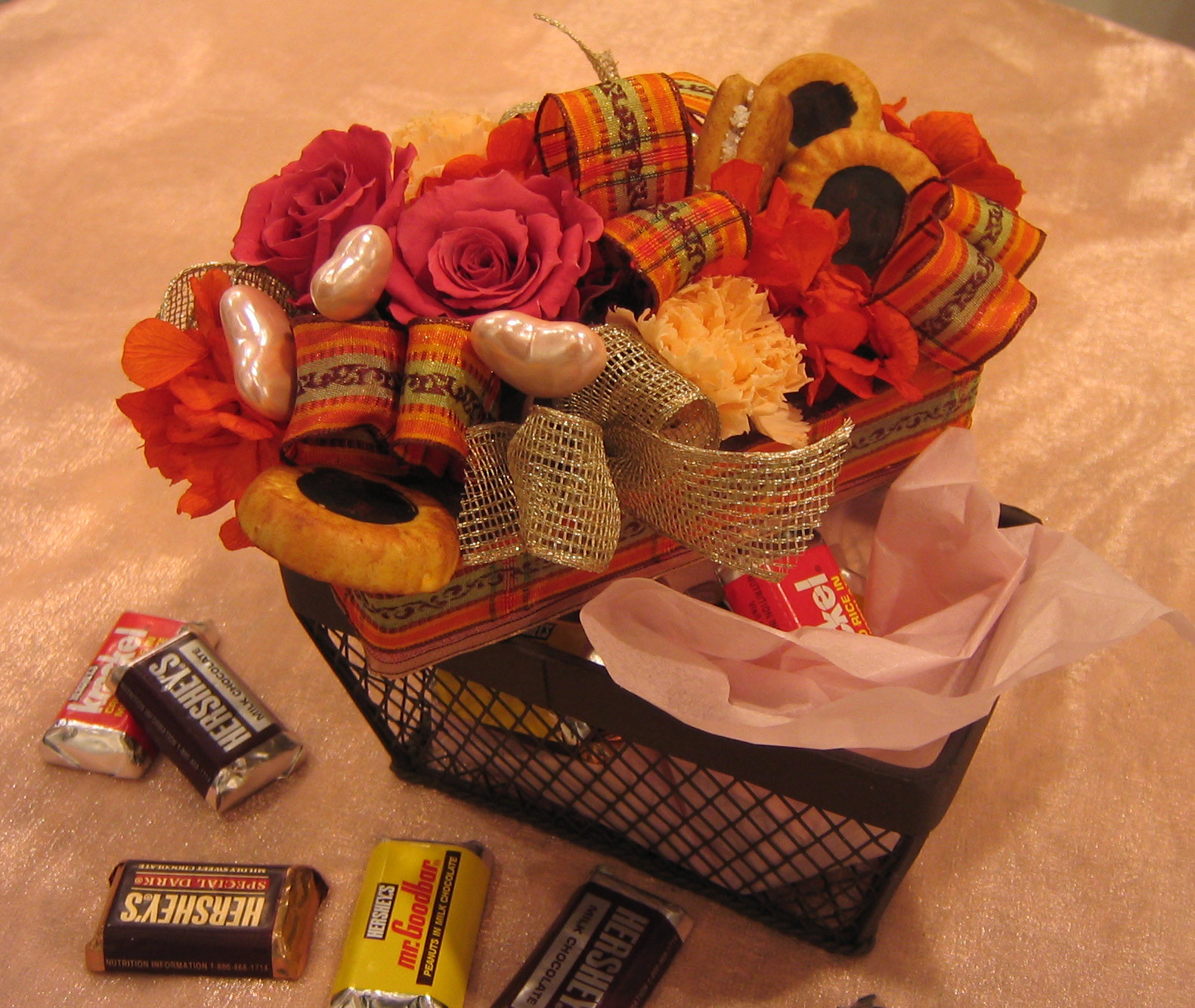 お菓子バスケットのふたにプリザーブドローズ,リボン,