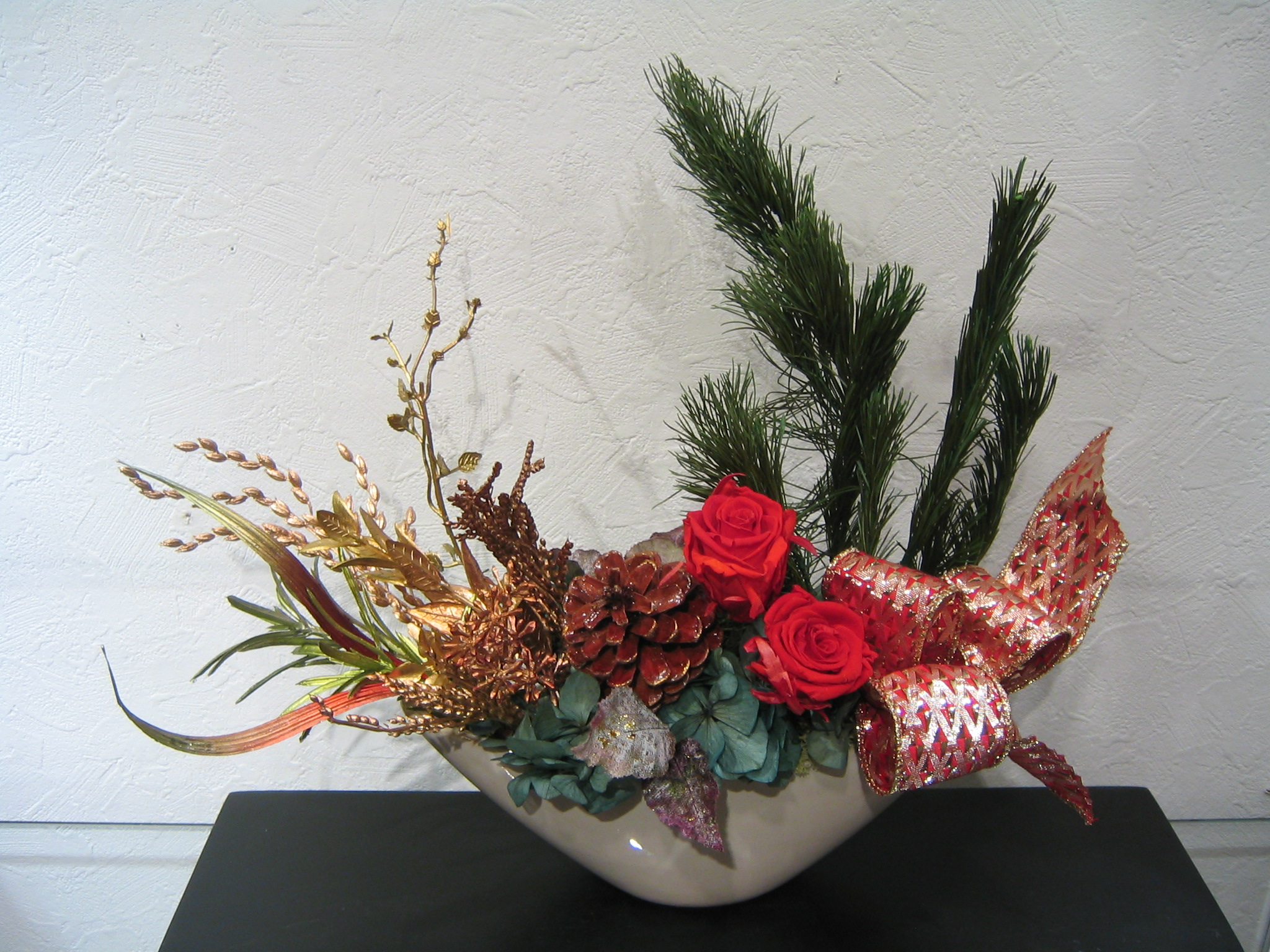 2つ目は白い花器に豪華にリボンとゴールドの素材をプラスした