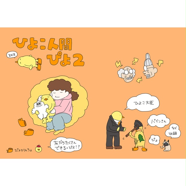 ひよこ人間ぴよ第2巻 - pyororintyo - BOOTHA5 フルカラー 無線綴じ 表紙マットPP / 56ページ (本文52ページ) この商品はpixivFACTORYの同人誌印刷サービス( https://factory.pixiv.net/books )で印刷・製本されます。 ひよこ人間第2巻です。 ひよこ人間ぴよ本編以外に、ひよこ大臣シリーズ、パインさんシリーズも収録されています。 ぴよを愛しく思っていただける一冊に仕上がったと思います。pyororintyo.booth.pm
