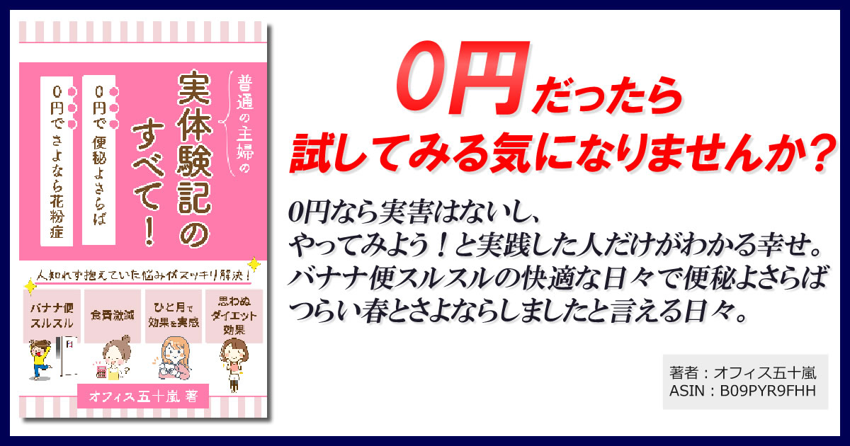 普通の主婦のリアル実体験のすべて! 0円で便秘よさらば&0円でさよなら花粉症|著者:オフィス五十嵐0円だったら試してみる気になりませんか?0円なら実害はないし、やってみよう!と実践した人だけがわかる幸せ。バナナ便スルスルの快適な日々で便秘よさらばつらい春とさよならしましたと言える日々。bookissue.biz