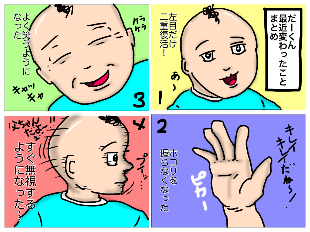 どうも、ホビトライです。今、だーくんに肋骨キックされながら記事をしたためています。思えばこの4カ月半、目に見える成長だけでも大きく変わってきただーくん。最近の変化を漫画にしてみました。首座り、寝返りはもちろんミルクの量や生活リズムの定着もそう。こうやって大きくなっていくんですね…あの、そろそろ肋骨蹴るのやめてもらっていいですか?次は皮膚を握られています。手が小さいのでつねられてる痛さです。握力も強くなってるんだね。強くなれだーくん。…でも、父ちゃんを傷つけないでね。それでは、また…!YouTubeはこちら