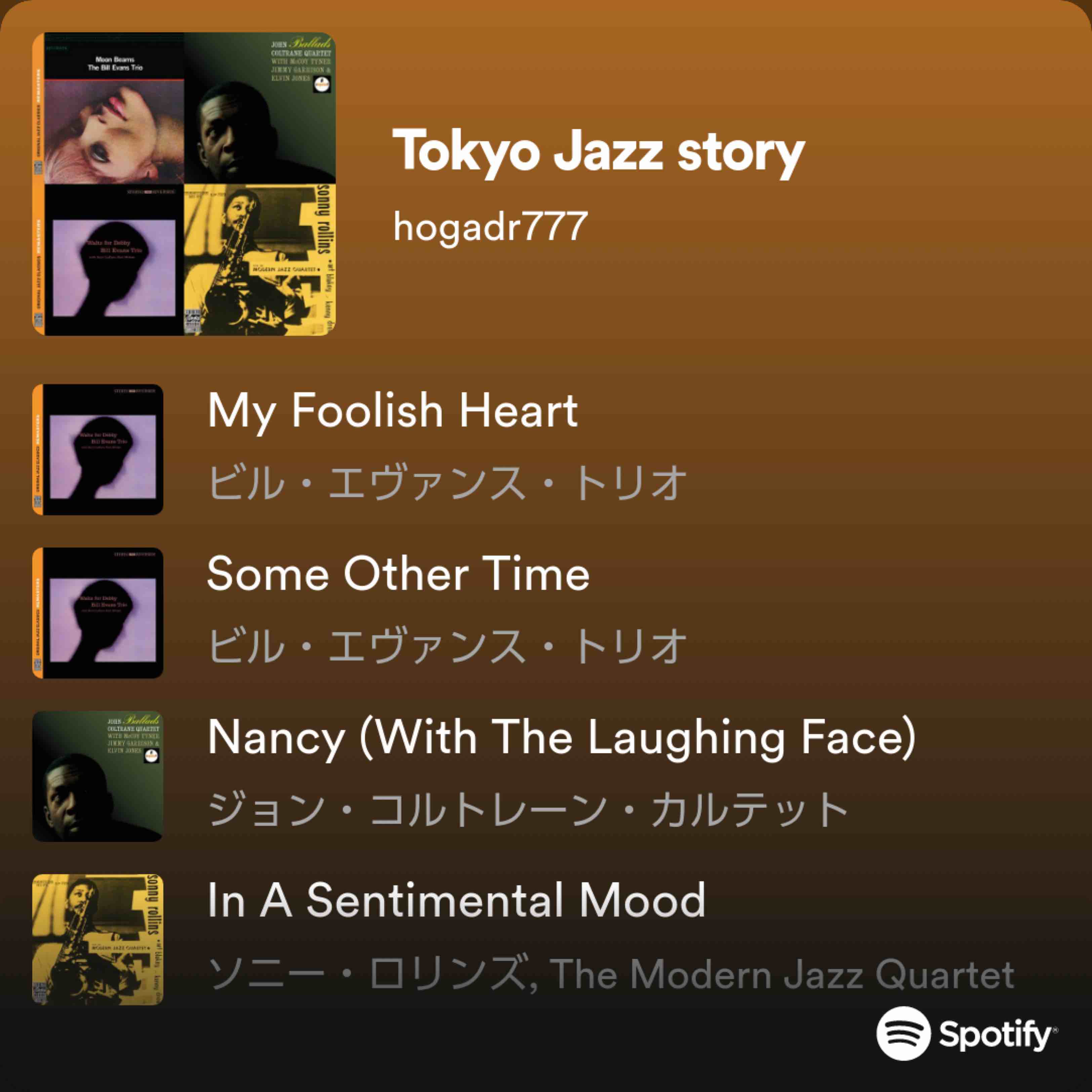 ⇧「私が選曲し、ミュージックアプリ『spotify』内で作ったJazz音楽のプレイリストです。プレイリストで『Tokyo Jazz  story』を選択してもらってっても聞くことができます。