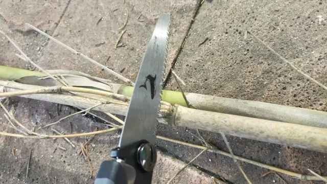 のこぎりで3本の竹をカットして、長さをそろえましょう。長さをそろえることで、トライポッド金具に差し込んだ後のバランスがよくなり、設置した際に倒れにくくなります。